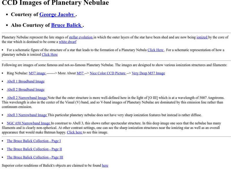 This home page is linked to detailed descriptions of nebulae types, shapes, and structures and their relationship to stellar evolution, a historical perspective on the discovery of nebulae, a gallery of images, and other related resources.