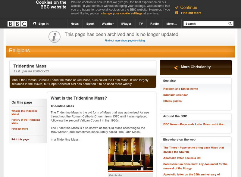 As part of the BBC's collection on religion and ethics, this site answers the question, "What is the Tridentine Mass?" The answer is very thorough in its analysis and includes two pages of material in addition to an audio clip.