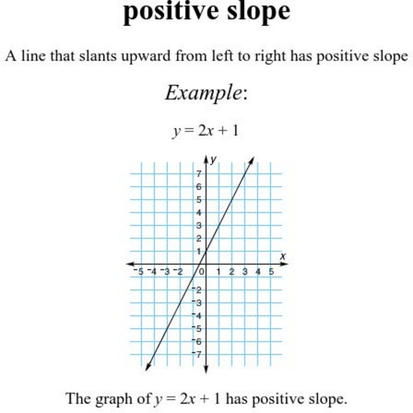 Contains one example of a line with a positive slope. Included is the equation for the line and a definition of a positive slope.