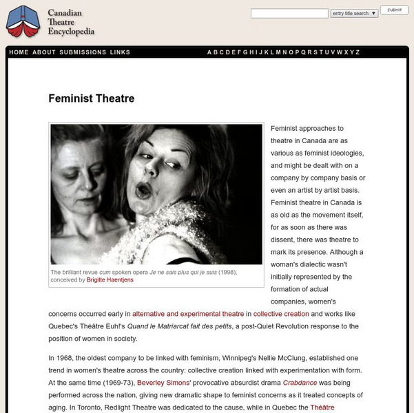 This section of the Canadian Theatre Encyclopedia looks at Feminist theatre in Canada, how it has changed and grown, as well as the impact it has had on Canadian theatre.