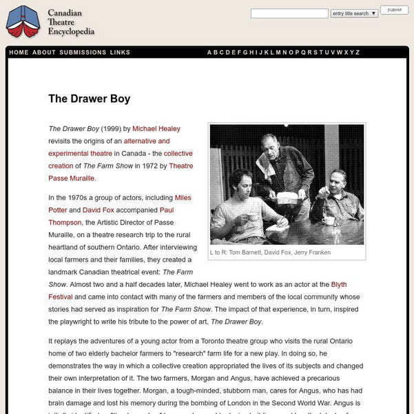 The Drawer Boy is a extension of The Farm Show, a collective creation. As a stand-alone play, it is a Canadian classic. This site also provides history of the Farm Show as well.