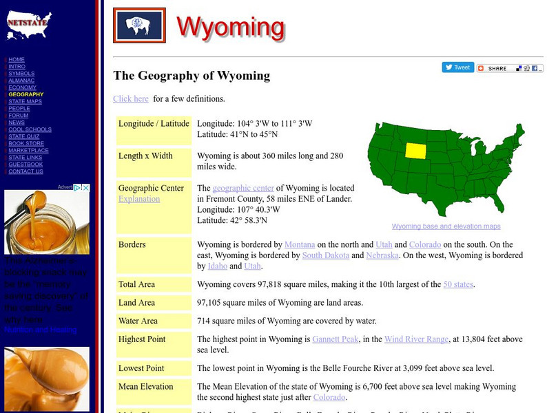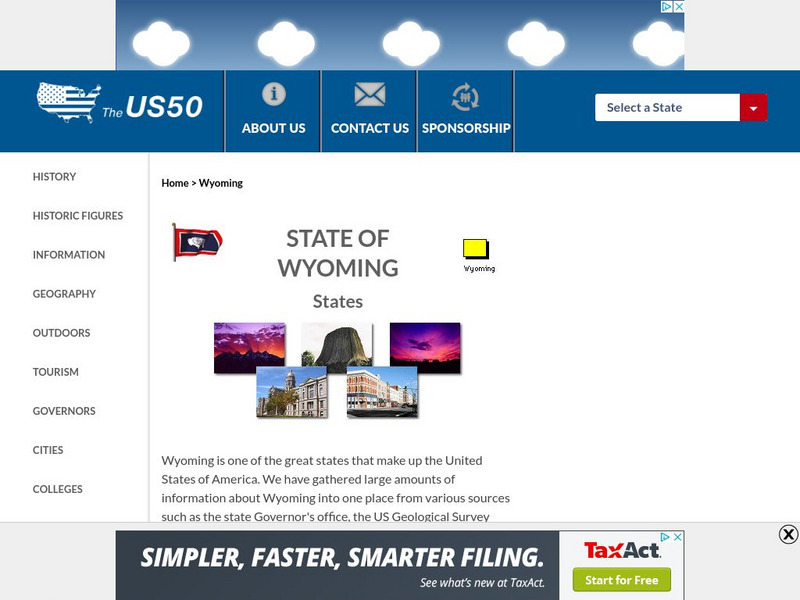 Presents key information regarding Wyoming history, famous people, cities, geography, state parks, tourism, and historic sites. A fact sheet of information and a quiz are also available.