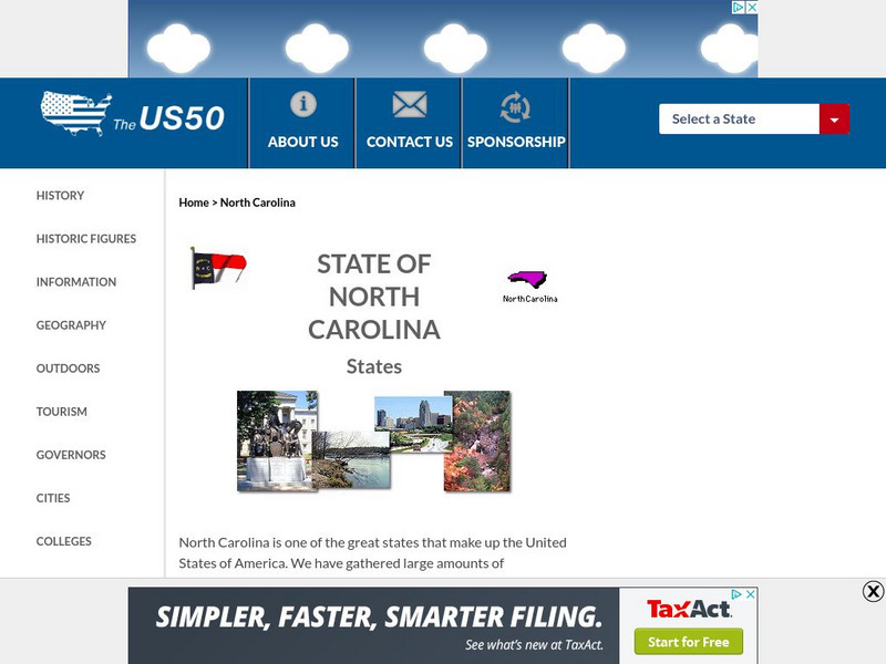 Presents key information regarding North Carolina history, famous people, cities, geography, state parks, tourism, and historic sites. A fact sheet of information and a quiz are also available.