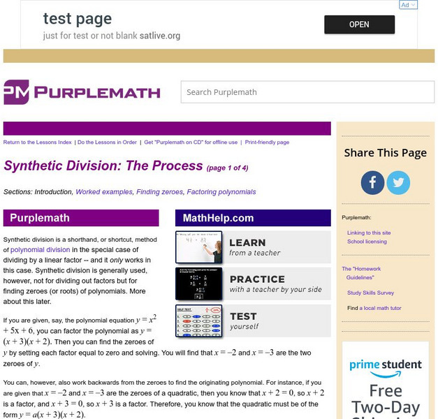 Works through a step-by-step example that gives a good explanation of how to do synthetic division. Also provides other example problems.