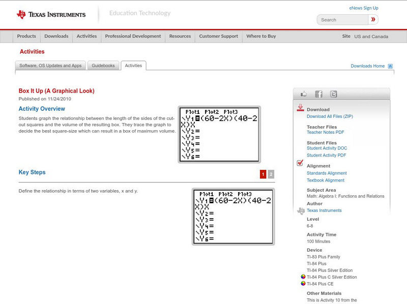 Students take a numerical and tabular look at finding the maximum value of an open box constructed by folding a rectangular sheet of material with cutout square corners. They also understand the concepts of independent and dependent...