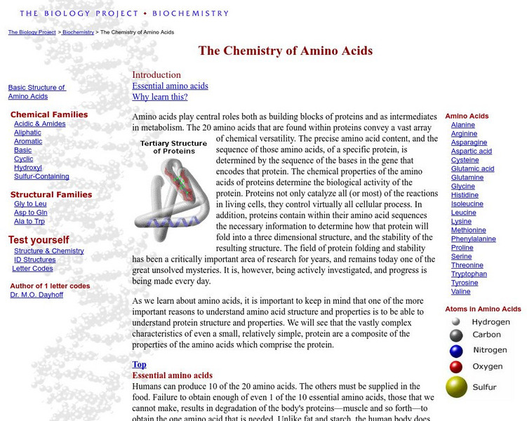 A great site for understanding Amino Acids, the building blocks for protein. Besides a very complete summary, the site includes a complete list of amino acids, a link to basic amino acid structure, a list if atoms in amino acids, and...