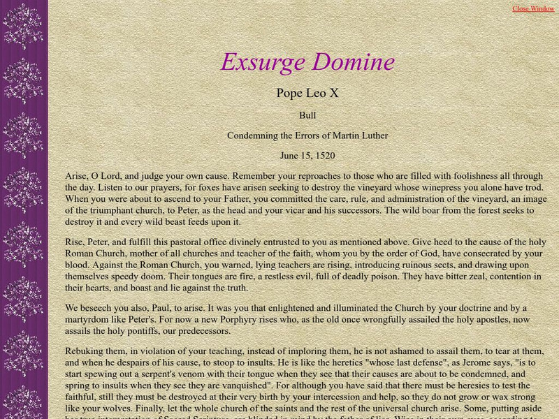This resource provides text written by Pope Leo X discussing his views on Martin Luther. Once you have come to the Papal Library you then need to locate "Leo X" in the first column. After you click on "Leo X" you you will be taken to a...