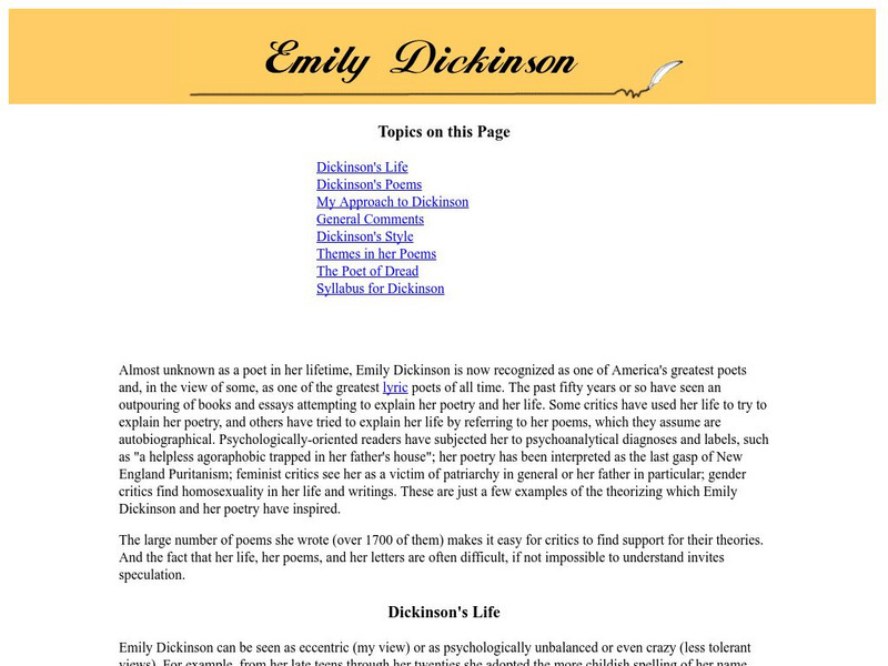 Web English Teacher provides links to information and resources on the 19th century American poet Emily Dickinson. Included are lesson plans, biographical information, critical analyses, and the texts of hundreds of Dickinson's poems....