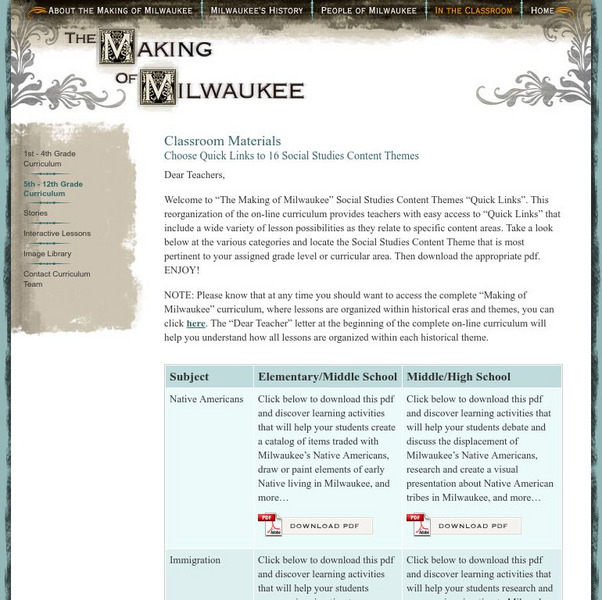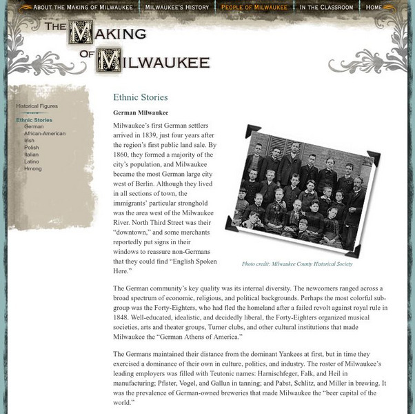 An amazing and comprehensive resource for teaching Milwaukee history to students in Grades 5 to 12. The materials cover topics such as immigration, industry, government, the world Wars, and so on. A free DVD of the video series can be...