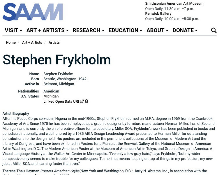 As part of the Smithsonian Art Museum's database of artists, Stephen Frykholm is described here along with information on his contributions to art through his poster design.