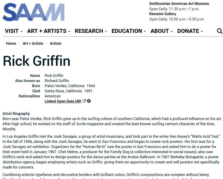 As part of the Smithsonian Art Museum's database of artists, Rick Griffin is described here along with information on his contributions to art through posters and poster design. While the site only provides one picture of one of his...