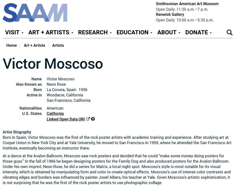 As part of the Smithsonian Art Museum's database of artists, Victor Moscoso is described here along with information on his contributions to art through poster design and his usage of photographic collage.