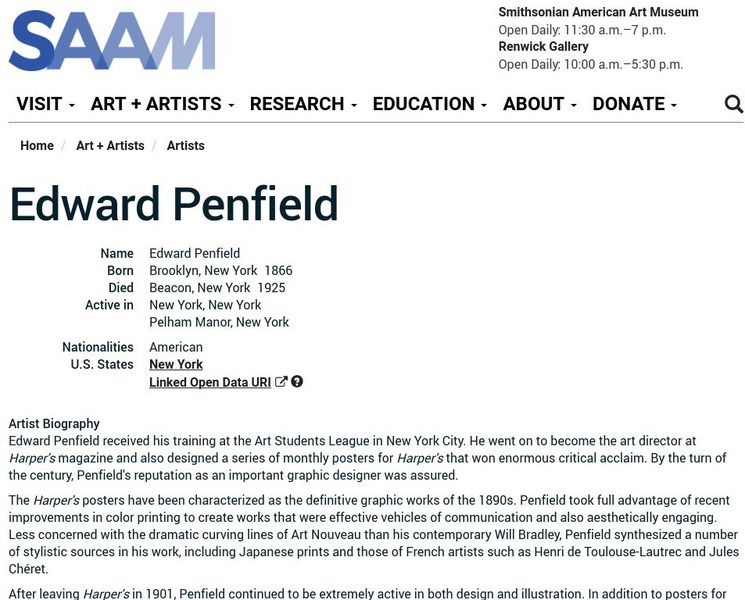 As part of the Smithsonian Art Museum's database of artists, Edward Penfield is described here along with information on his contributions to art through his posters and poster design.