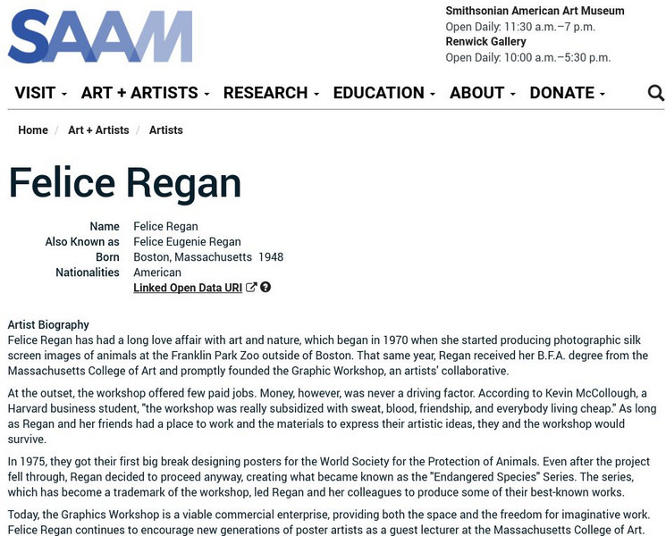 As part of the Smithsonian Art Museum's database of artists, Felice Regan is described here along with information on her contributions to art through poster design.