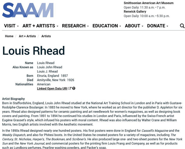 As part of the Smithsonian Art Museum's database of artists, Louis Rhead is described here along with information on his contributions to art through posters and poster design.
