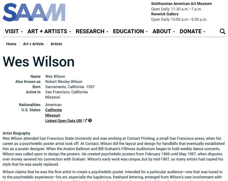 As part of the Smithsonian Art Museum's database of artists, Wes Wilson is described here along with information on his contributions to art through his poster design.