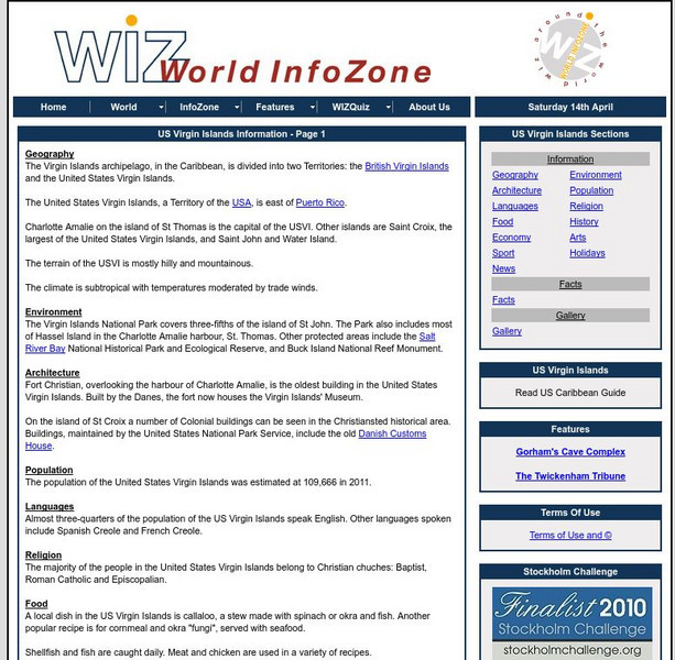 Great reference tool that is full of useful information about the US Virgin Islands in the Caribbean. Content includes: geography, environment, architecture, religion, food, history, economy, arts, sports, and news. Be sure to look at...