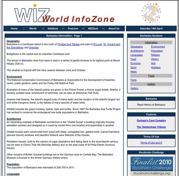 Great resource that is full of useful information about the Caribbean Island of Barbados. Content includes geography, environment, architecture, religion, food, history, economy, arts, sports, and news. Be sure to look at the fact sheet...