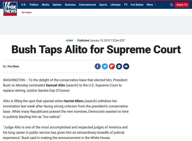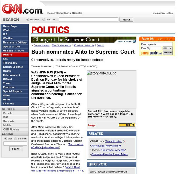 This article from November, 2005, discusses the nomination of Samuel Alito for Supreme Court Justice. His ideology, judicial record, and the controversy surrounding President George W. Bush's nomination of Alito are all discussed.