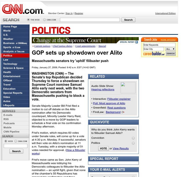 The confirmation of U.S. Supreme Court Justice, with particular emphasis on the fight in the Senate, is highlighted in this report from January, 2006. A transcript, audio, and video are available.