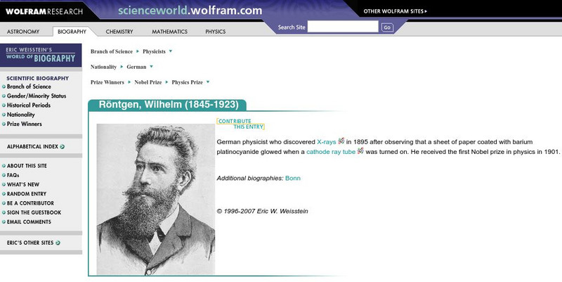 This site from ScienceWorld provides a very short biographical sketch of Wilhelm Rontgen (1845-1923 CE) and describes his most notable scientific discoveries and contributions.