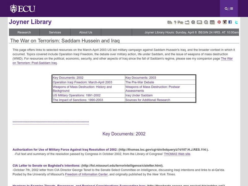East Carolina University provides students with a general outline of primary source documents all concerned with the War in Iraq. The outline begins with documents from 2002 and 2003 but includes various other documents about Iraq,...