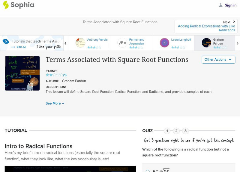 The basic terms of a square root function are defined in this video tutorial. The lesson provides examples of radical functions, power functions, and radicands. Students can check their understanding with an assessment.