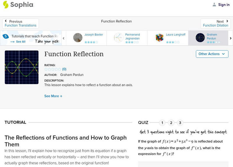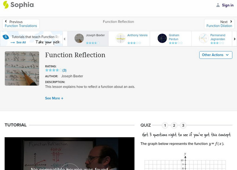 Determine from an equation if it has been reflected on an axis then graph the equation and reflection in this video tutorial. [9:13] Assess learning with a quiz.