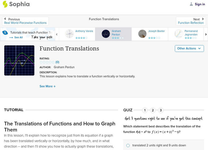 In this video tutorial, explore whether a vertical or horizontal translation of a function is occurring. Assess learning with a quiz. [8:42]