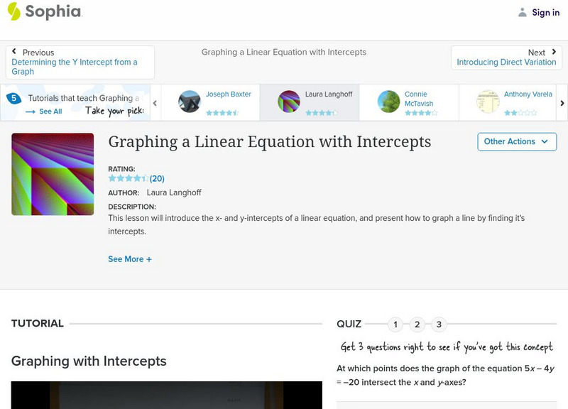 The mathematics resource includes a video lesson that explores how to graph a linear equation with intercepts. The lesson discusses the x-intercept, y-intercept, and how to graph a linear equation.