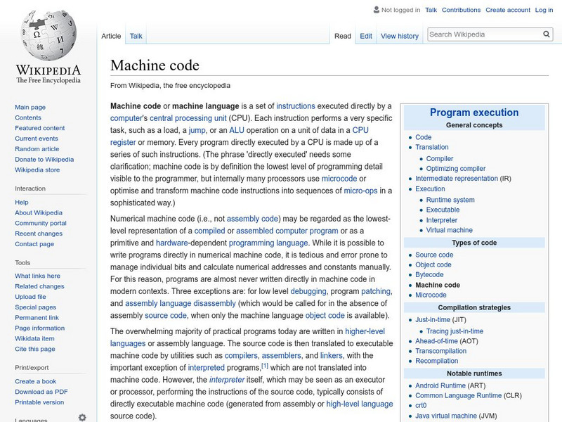 A Wikipedia description of machine code (or language), which is the set of instructions executed directly by the computer.
