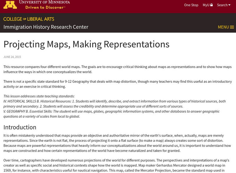 This resource compares four different world maps. The goals are to encourage critical thinking about maps as representations and to show how maps influence the ways in which one conceptualizes the world.