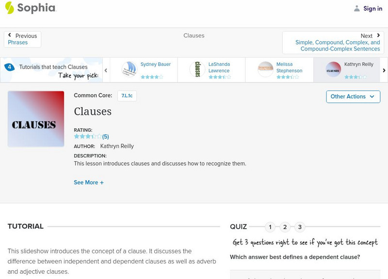 This slideshow lesson focuses on clauses; it defines the term and the two main types: independent and dependent. It lists the two types of dependent clauses: adjective and adverb; it provides examples of each, explains how to identify...