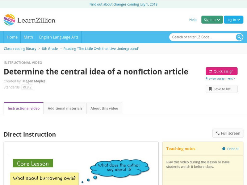 Learn Zillion: Determine the Central Idea of a Nonfiction Article