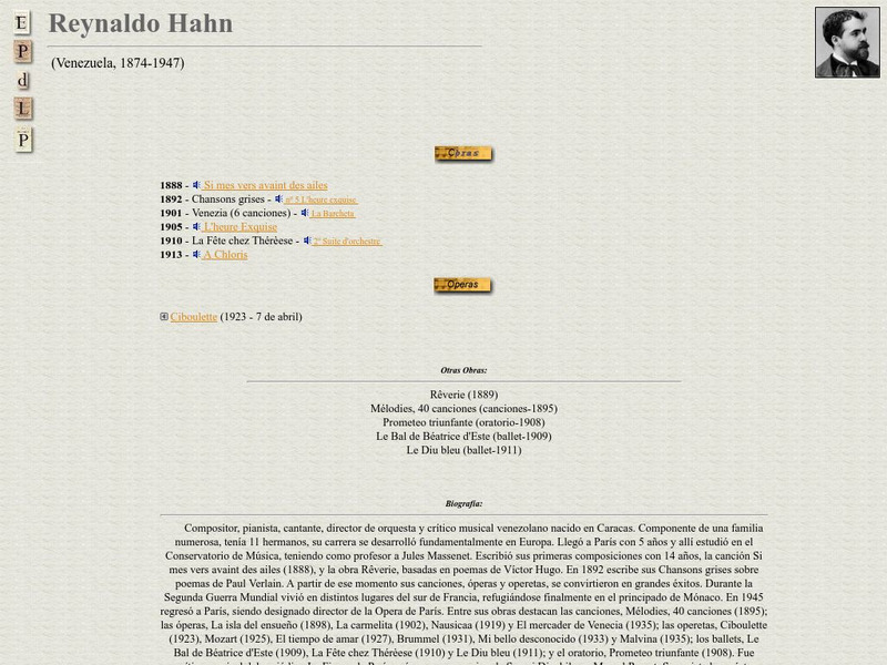 This page has a brief bibliography of the Venezuelan composer, singer and pianist Reynaldo Hahn.