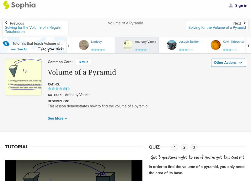 [Accessible by TX Educators. Free Registration/Login Required] Learn how to calculate the volume of a pyramid and how this compares to the volume of a prism. Then solve problems about the volume of rectangular and triangular pyramids....
