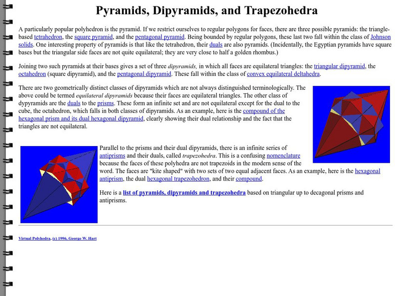 This site is a personal site that discusses the popular polyhedron, the pyramid. It explains that by joining two pyramids you will get a dipyramid.