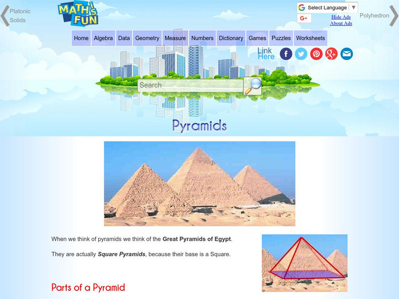 Students learn about the terminology and formulas associated with pyramids. The learning resource consists of definitions, images, and examples.