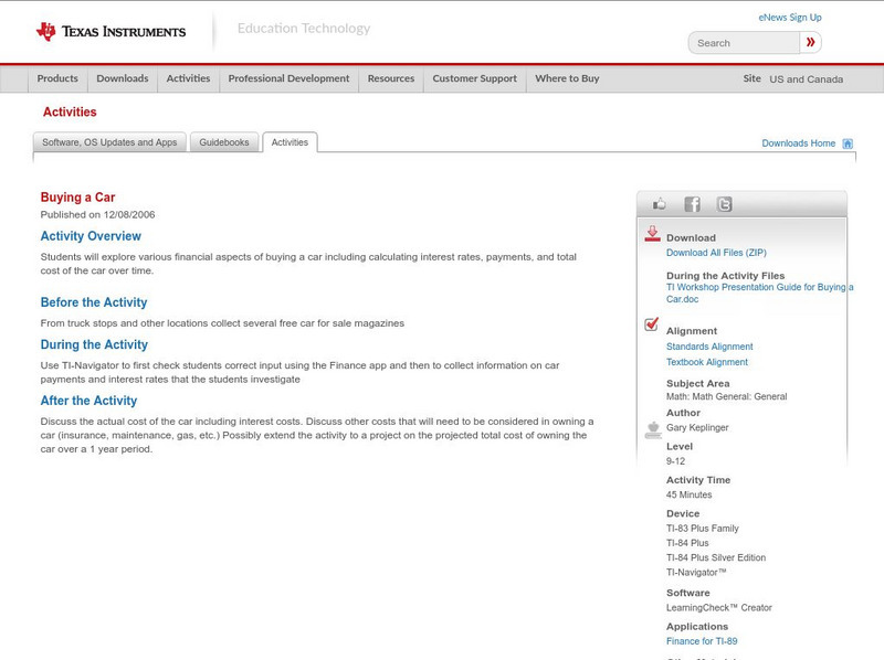 Students will explore various financial aspects of buying a car including calculating interest rates, payments, and total cost of the car over time.
