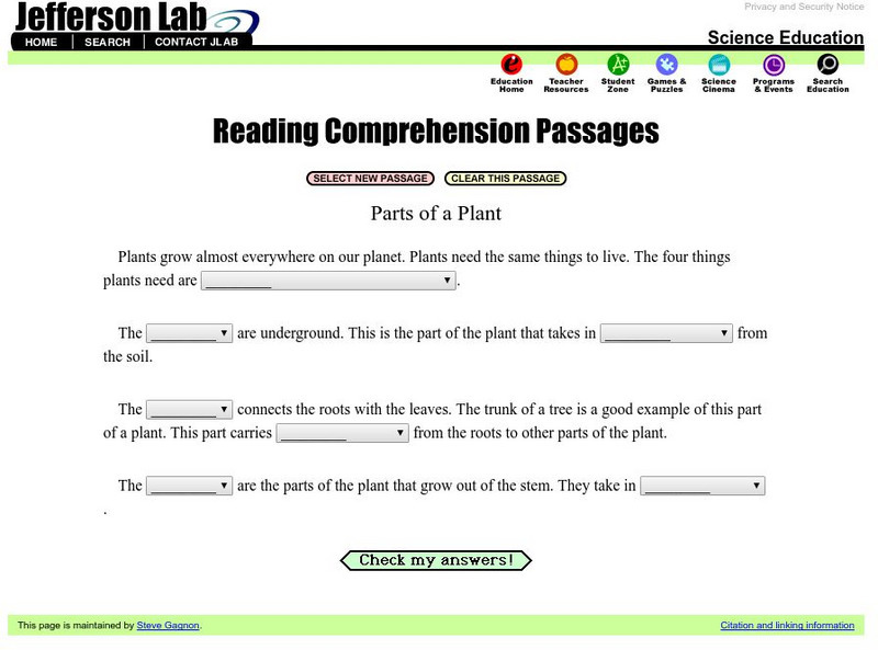 Read and fill in the blanks of this passage explaining the parts of a plant. Each blank has a dropdown menu with choices. When you finish, click CHECK MY ANSWERS. If you pick a wrong answer, the right answer will be displayed along with...
