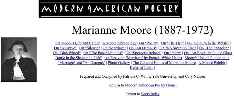 You can rely on this site for biographical and critical views of Marianne Moore (1887-1972 CE) and her work. It includes criticism of a number of poems, a photo gallery, an exhibit and a biography.