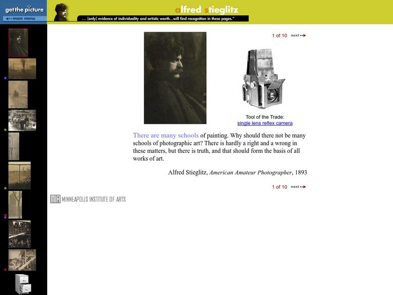 Through a slide show series of ten slides, this site tells the story of Alfred Stieglitz and his art of photography. The slide show also highlights specific photographs of Stieglitz.