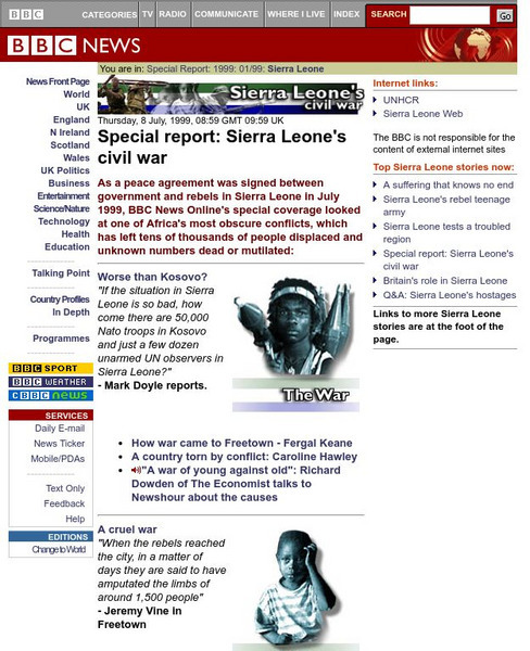 The BBC presents links to numerous topics relating to the Civil War in Sierra Leone. (July 8, 1999)