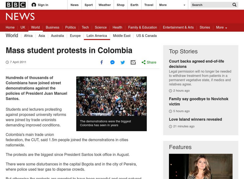 This article discusses the mass protests occurring in Colombia concerning the policies of President Juan Manuel Santos. (April 7, 2011)