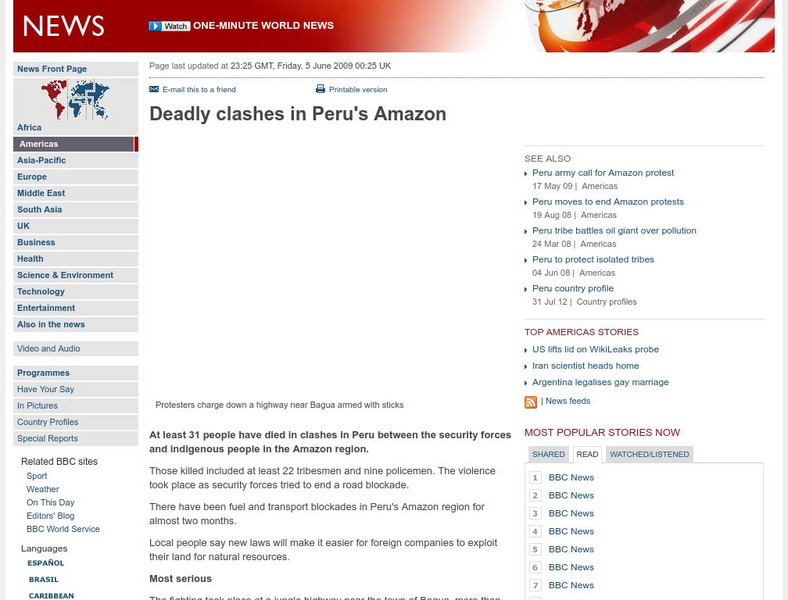 This short article and video describe the clashes occurring in the Amazon between Peruvian security forces and indigenous Amazon tribes. (June 5, 2009)