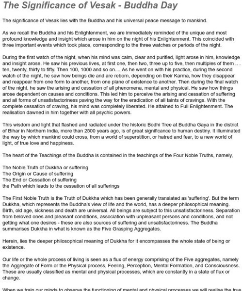 This article discusses the significance of Vesak, or Buddha day, on which Buddhists celebrate the birth of the Buddha.