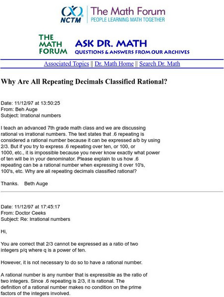 Math Forum response to why all repeating decimals are rational numbers, including examples and concise explanations.