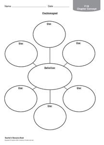 In this electromagnet worksheet, students will complete a graphic organizer by writing in the definition and 6 uses of electromagnetism.