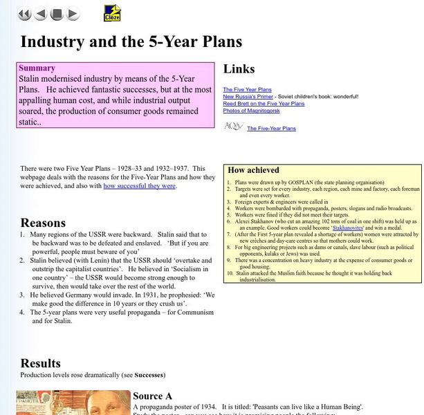 This site describes the industrialization plans implemented by Stalin. Examines the success and failures of each and how they were achieved. Information is laid out so that it is easy to access and understand.