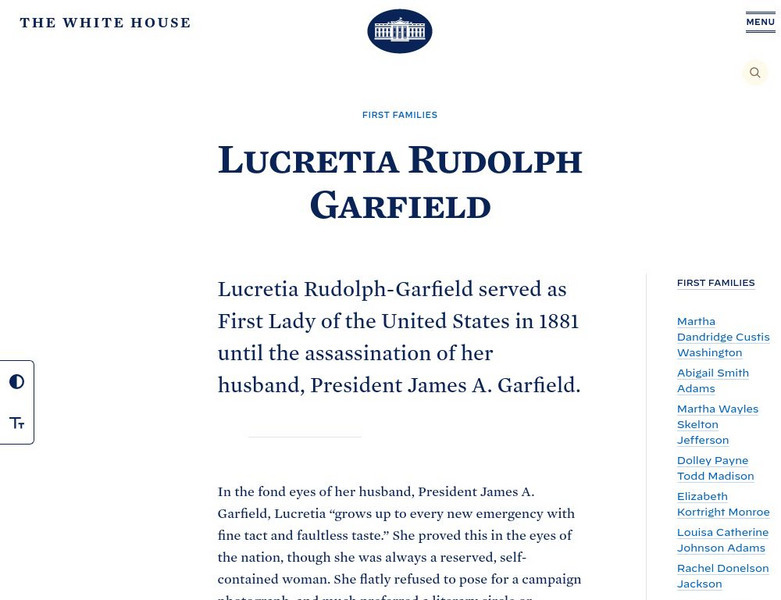 Biographical information of First Lady Lucretia Rudolph Garfield, wife of James A. Garfield.